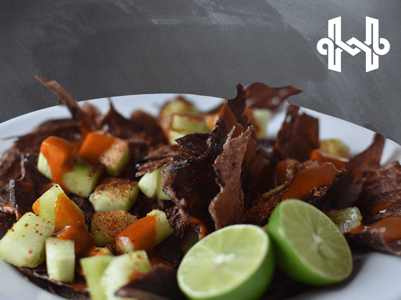 60 grs de carne seca con salsa Maggie, limones, Tajin y pepino.