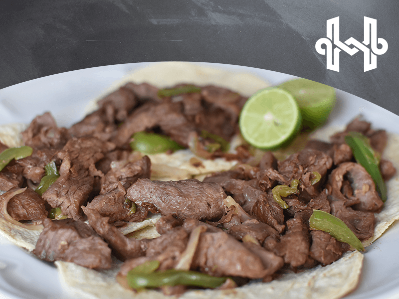 250 grs de arrachera, chile morron, cebolla, tocino, limon y salsa.